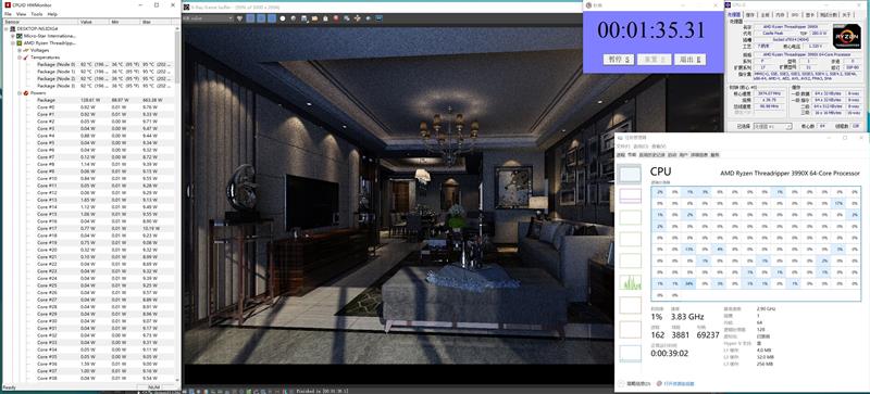 为了让大家更加直观的看到测试成绩,我们使用一个秒表来记录时间。在渲染的过程中,ThreadRipper 3990X 128个线程被完全满载。