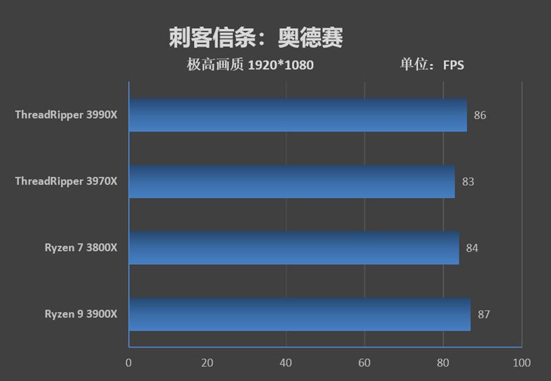 令人没有想到的是,ThreadRipper 3990X跑《刺客信条:奥德赛》竟然比ThreadRipper 3970X还要快一点点,成绩和锐龙9 3900X差不多。