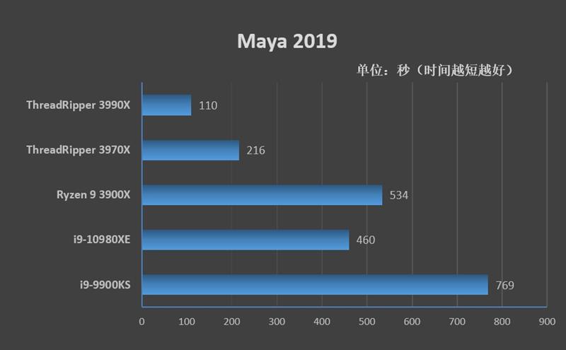在Maya 2019的测试中,ThreadRipper 3990X 128个线程性能全部释放,渲染性能几乎是ThreadRipper 3970X的2倍,是i9-10980XE的四倍以上。
