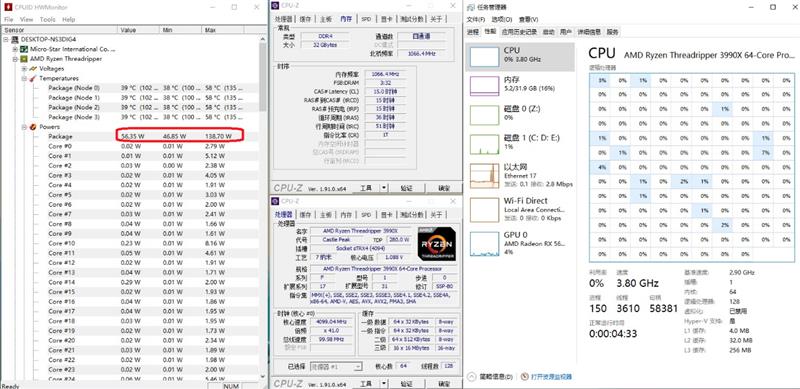 在2133MHz的默认频率下,在待机状态下,ThreadRipper 3990X核心最低功耗为47W,大多数时候维持在60W附近。