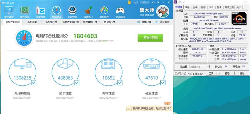 在CPU-Z v1.91的测试中,ThreadRipper 3990X的单线程性能略逊于锐龙9 3900X。