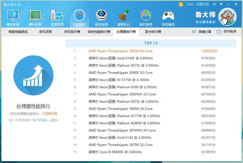 处理器排行榜遥遥领先于所有对手,传说中的28核Xeon W-3175X处理器也就43万分,不到ThreadRipper 3990X的1/3。