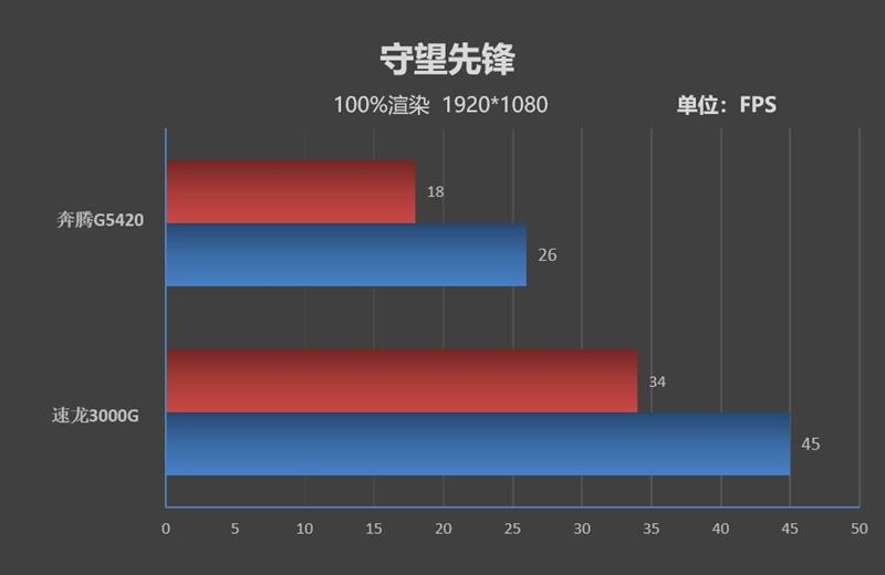 《守望先锋》中无论是中画质还是低画质,G5420都没有到30FPS,完全失去了可玩性。速龙3000G在中画质下有34帧,勉强能玩;在低画质时时则能达到45帧,可以相对流畅的进行各种复杂的走位和操作,适当降低分辨率还可以进一步提升流畅度。