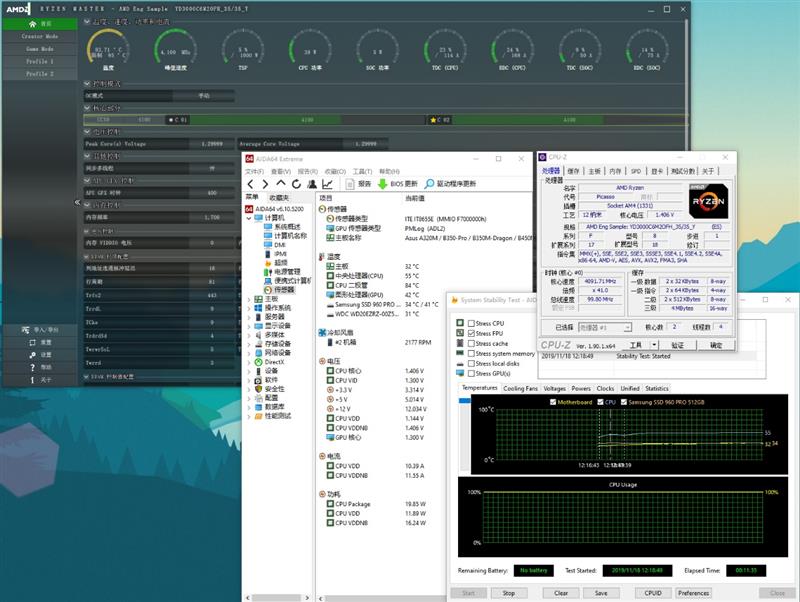 华硕PRIME B350-PLUS主板的BIOS简单,超频只需要设置倍频就行了,连电压都是自动的,我们直接将频率拉倒4.1GHz,成功进入系统后就开始了烤机测试。