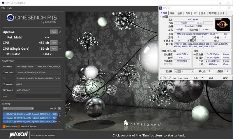 超频到4.1GHz之后,单线程分数达到了159cb,多线程则有452cb。