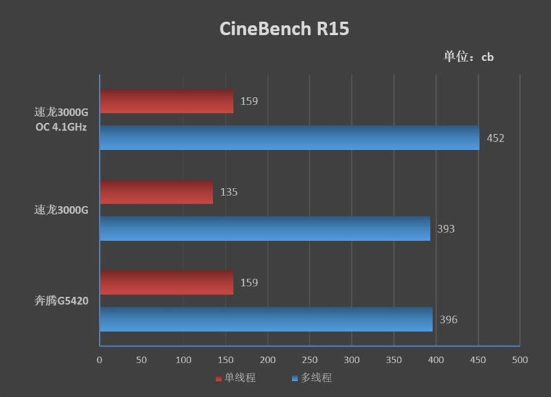 超频到4.1GHz之后,速龙3000G的单线程成绩与G5420相同,多线程成绩能大幅超出56分,领先幅度达到了15%。