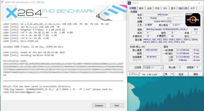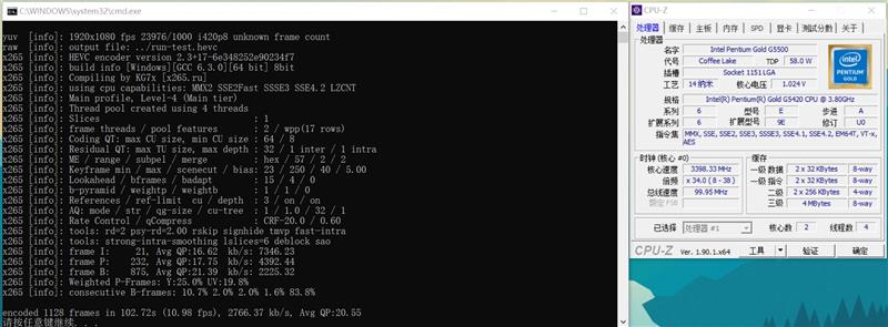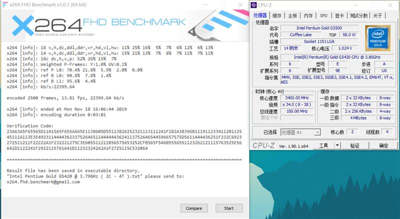 X265 FHD Benchmark的情况也类似,默频的速龙3000G稍稍落后于奔腾G5420,超频之后则能领先12%。