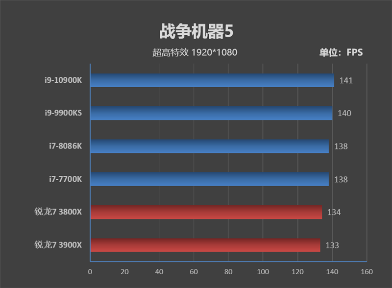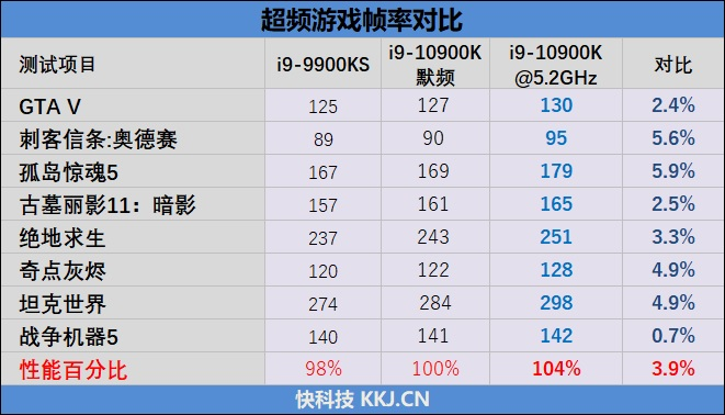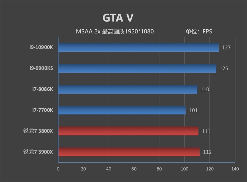在《GTA V》中,i9-10900K跑出了127FPS的帧率比i9-10900K高了2FPS,比起三年前的旗舰i7-7700K则足足多了26FPS。