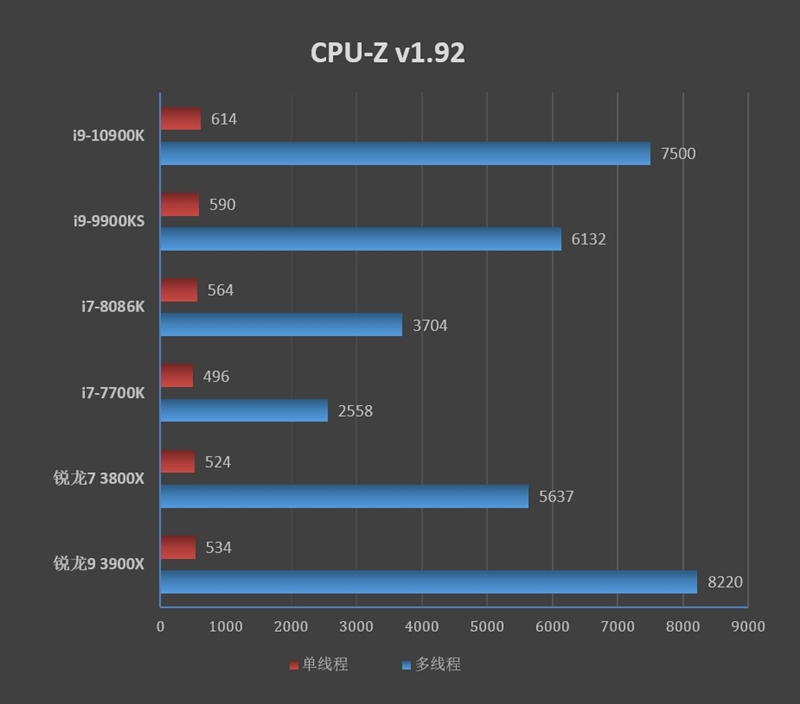 i9-10900K的614分是目前为止CPU-Z的最高单核成绩(默频)。至于多核性能,i9-10900K比i9-9900KS强了22%,和锐龙9 3900X之间的差距约为10%。