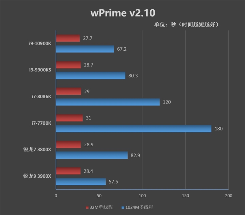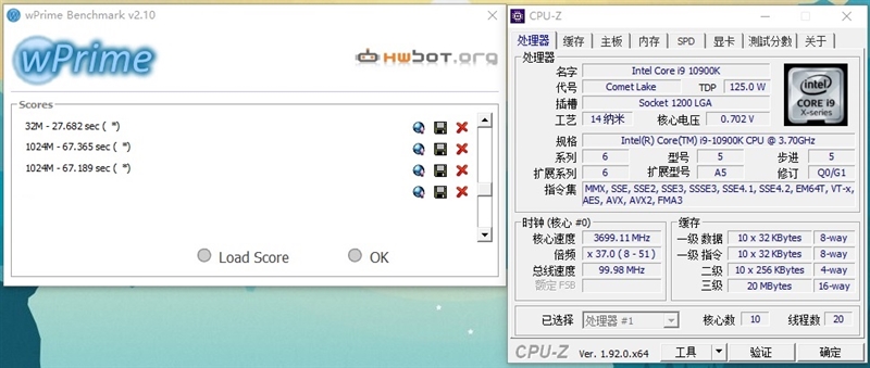 在wPrime 32M单线程性能测试中,i9-10900K耗时27.7秒;多线程跑完wPrime 1024M则用掉了67.2秒。