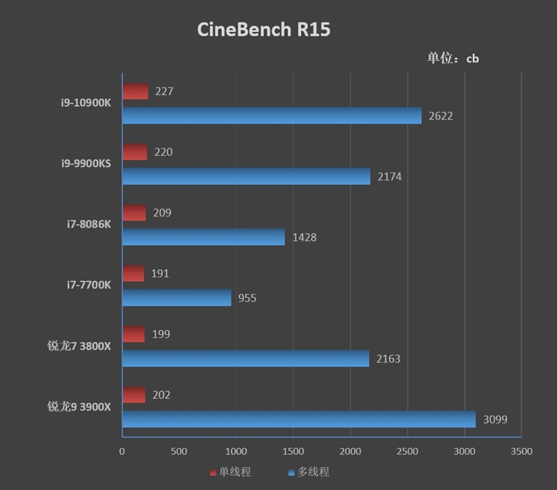i9-10900K单线程分数为227cb,多线程成绩则为2622cb。