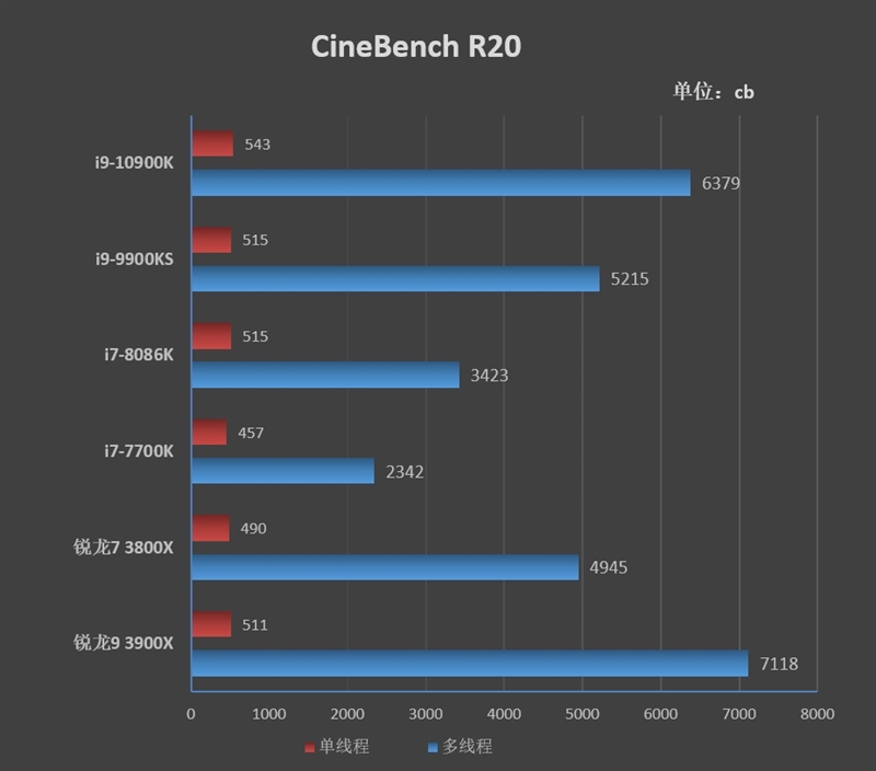 i9-10900K单线程分数为543cb,多线程成绩则为6379cb。