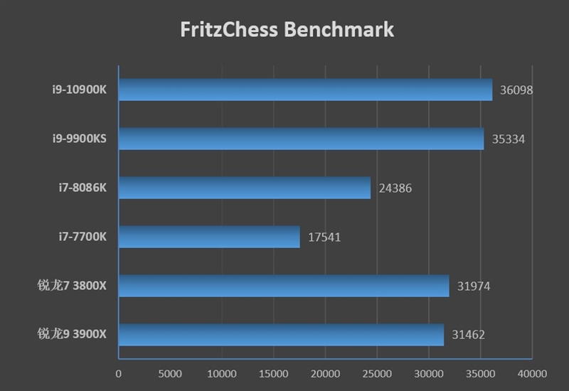 FritzChess Benchmark最多只能支持16个线程,因此i9-10900K与锐龙9 3900X并未发挥全部性能。不过即便如此,i9-10900K的性能依然是最强的。