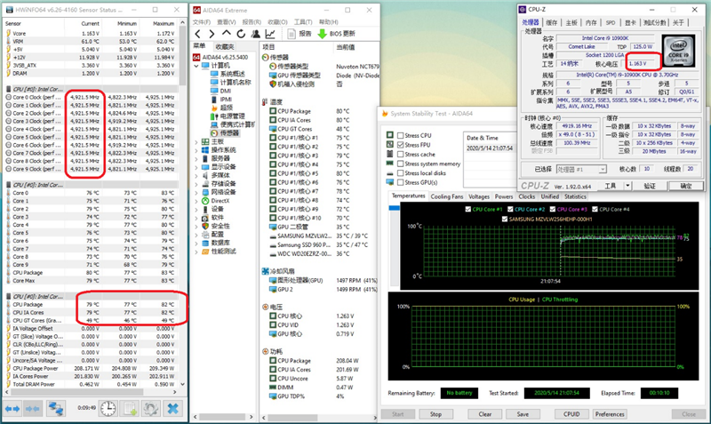 使用AIDA64 FPU进行10分钟的烤机测试之后,i9-10900K的运行电压为1.163V,烤机功耗208W,烤机温度79度。