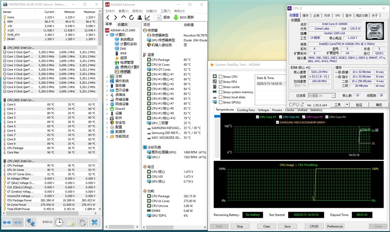 5.2GHz的 i9-10900K单线程分数为225cb,多线程成绩则为2757cb。最高运行功耗276瓦,最高温度89度。
