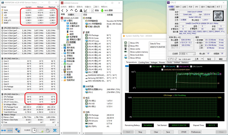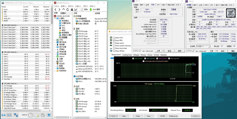 在核心5.2GHz + 内存双通道4500MHz + 缓存5.0GHz时仅仅运行了AIDA64 FPU不到1分钟,温度就超过了100度,继续烤机没有太大意义。