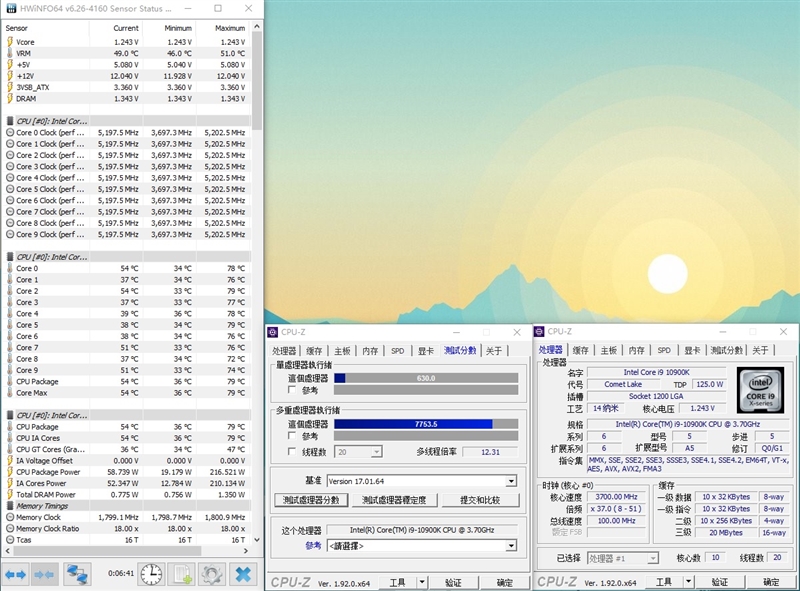 目前所有的十代i7/i9处理器都支持睿频加速 Max 3.0技术,而且这个技术在Z490主板的BIOS中默认就是开启的。可能CPU-Z会显示i9-10900K依旧是5.1GHz,但不必在意,因为实际上是可以达到5.3GHz的。