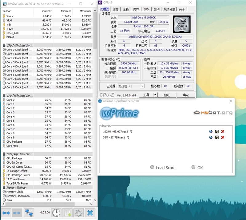 超频到5.2GHz之后,i9-10900K处理器32M单线程成绩为27.8秒,1024M多线程成绩为63.4秒。最高运行功耗257W,最高温度88度。