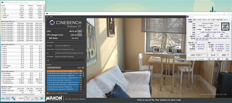 在CineBench R20中,5.2GHz的i9-10900K单线程分数为536cb,多线程6672cb。最高运行功耗286瓦,最高温度91度。