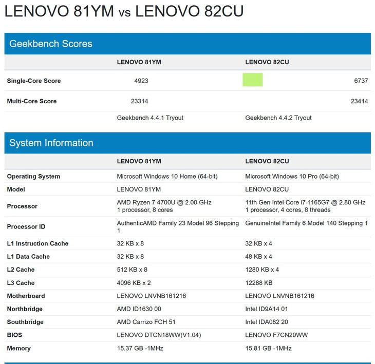 从Geekbench的跑分成绩来看,酷睿i7-1165G7的单核心成绩为6737,多核心成绩为23414。多核心性能与8核心8线程配置的AMD锐龙7 4700U基本一致。