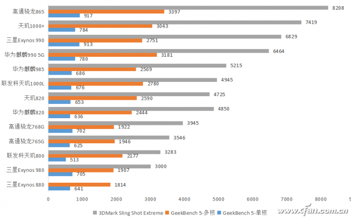 从5G SoC理论性能排行来看,联发科天玑系列取得了不俗的成绩,天玑1000+仅次于骁龙865,天玑1000L和麒麟985处于一个档次,天玑820可小胜麒麟820,天玑800的综合实力也优于三星Exynos 980。