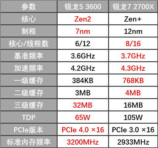这两款处理器不是一代,设计上有不小的差别,咱么先看看它们的具体规格参数吧。锐龙7 2700X的王者威风还在,最重要的频率、核心、缓存都有优势。不过锐龙5 3600的三级缓存和TDP也真的是猛,都大幅超过了曾经的王者,同时还具有新核心的高效率。