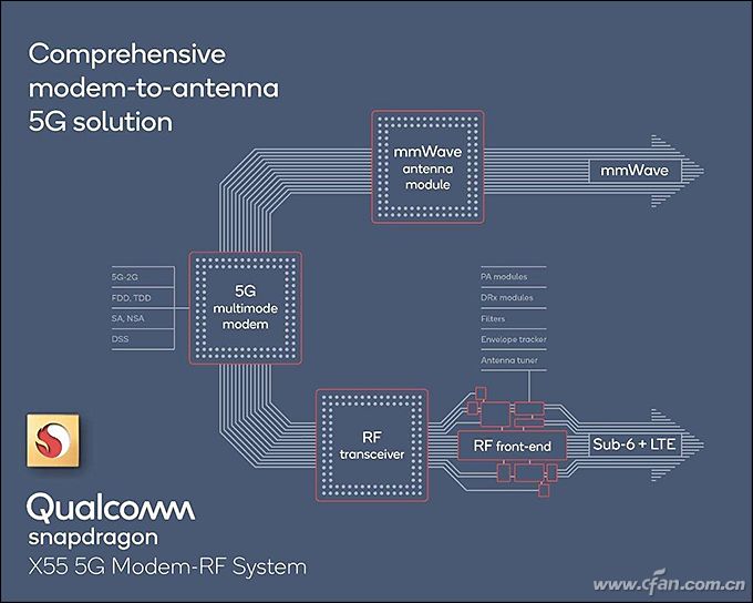 出于大规模量产(台积电7nm工艺比7nm+EUV工艺更成熟)和成本的考虑,高通骁龙865此次并没有集成基带,严格来讲它只是一颗AP芯片。搭载骁龙865的手机要想连接5G/4G/3G/2G网络,必须外挂官方指定的BP——骁龙X55基带芯片。