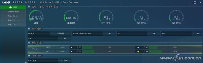 如果手动超频,则锐龙3 3100/3300X的普遍超频极限在4.4GHz和4.5GHz。有些用户在加强散热并略微提升电压后,部分处理器甚至能稳定在4.6GHz并冲击4.7GHz。