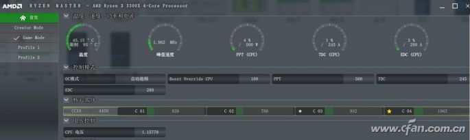 而在超频方面,我们直接使用了AMD提供的RyzenMaster工具,以GameMode(游戏模式)进行超频,可以看到两款处理器均采用了全核超频的模式,而最终的稳定频率分别为4.0GHz和4.45GHz。