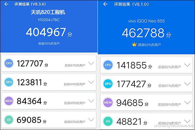 以Redmi 10X的工程机和iQOO Neo 855版的安兔兔跑分为例,二者的差距其实还是蛮明显的,特别是GPU性能相差巨大,玩游戏的体验肯定是骁龙855秒杀天玑820的节奏。