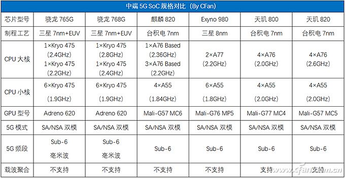 我们不妨再来看看天玑820与其他中端5G SoC的规格对比,在这些芯片中,Exyno 980采用的Cortex-A77 CPU架构最先进,可惜它的主频偏低,集成了上代Mali-G76GPU而且核心数量较少,所以综合性能垫底。