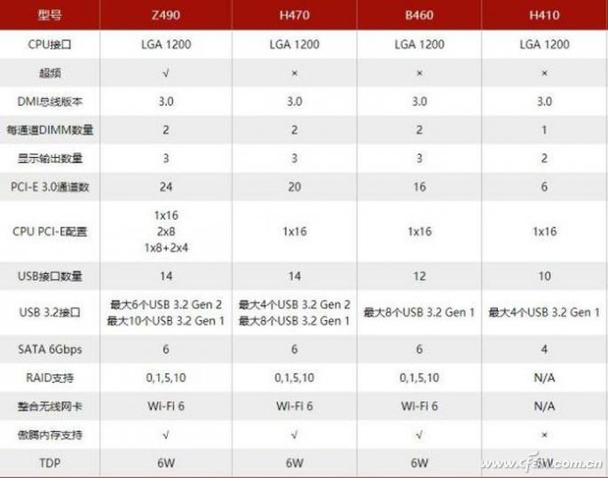从功能参数上看,B460实际上是从B365改进而来,主要变化就是支持LGA1200,PCIe通道的数量不少(16个),但仍没有原生USB 3.2 Gen2(10Gbps)接口和内置无线网卡。H410的改进稍多一些,DMI总线和PCIe总线升级为3.0版本,算是跟上了潮流,不过PCIe通道、USB 3.2 Gen1还是6个和4个,同样没有内置无线网卡和高速USB,也不支持傲腾内存。