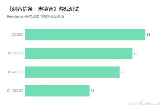 《刺客信条:奥德赛》作为比较吃配置的3A大作,只能在最低画质下进行测试了。在这种负载压力很大的游戏中,R5和R7的差距开始显现,不过R7 4800U能够达到MX250 90%的表现也可以说是很优秀了。