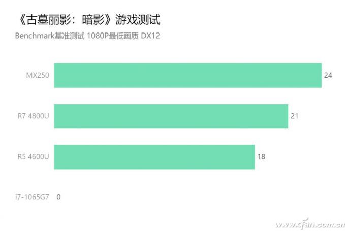 《古墓丽影:暗影》是一款支持DX12的3A大作,两款锐龙与MX250的差距与之前的《刺客信条:奥德赛》类似,不过i7-1065G7不管重启多少次都会在基准测试过程中崩溃,无法运行游戏。