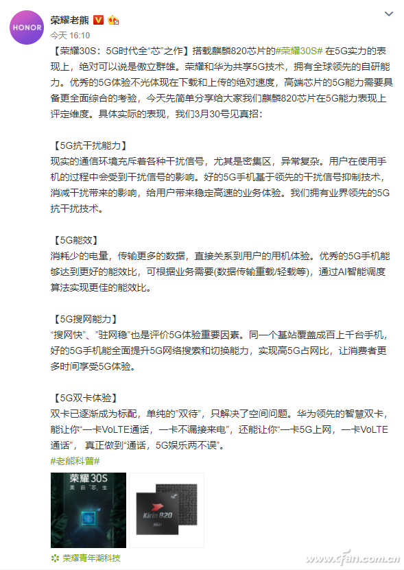 荣耀30S该产品最大的特色之一,就是首发麒麟家族最新的5G SoC——麒麟820 5G。那么,当这颗5G芯片问世后,它与骁龙765G、Exyno 980、联发科天玑1000L这些中高端5G SoC之间又是孰强孰弱呢?
