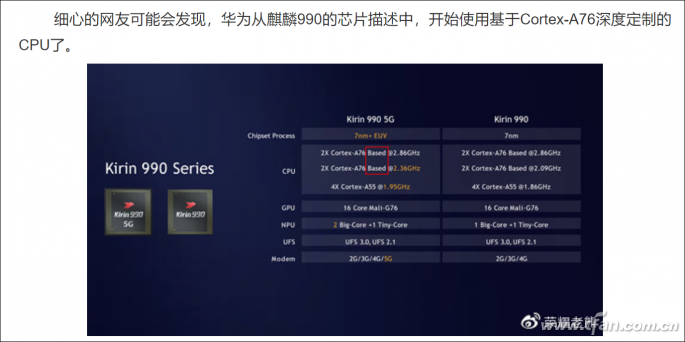 究其原因,要么麒麟820给Cortex-A76核心赋予了超过2.6GHz的主频(不太可能,中端SoC的大核主频很少有超过2.3GHz的时候),要么就是它参考了麒麟990的设计——采用了基于原生Cortex-A76深度定制的魔改核心,就好像高通骁龙家族的Kryo。