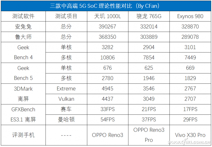 最后附上天玑1000L、骁龙765G和Exyno 980的跑分对比,你觉得麒麟820的综合性能能超越这些5G前辈吗?