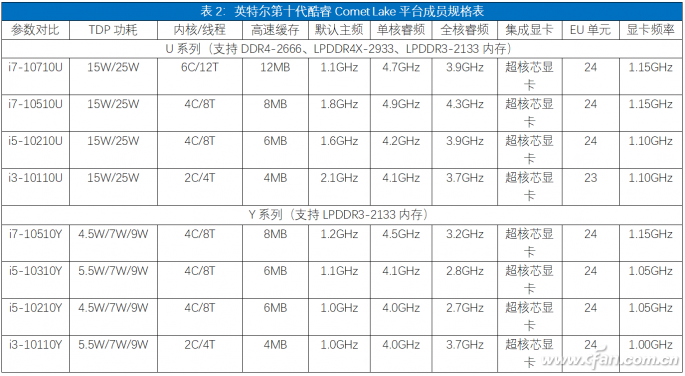 虽然缺少了10nm工艺和最新微架构的加持,但Comet Lake采用的14nm++工艺却更加成熟稳定,让英特尔实现了在15W TDP(U系列,Comet Lake-U)不变的基础上首次达成6核心12线程的历史突破,并在4.5W TDP(Y系列,Comet Lake-Y)不变时全系列进化到4核心8线程。需要注意的是,和第八代酷睿平台相比,Comet Lake此次大幅调低了默认主频(表1),但同时调高了睿频加速频率,想长时间超水平发挥性能,离不开更好的散热环境待遇。