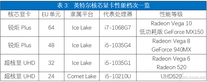 其中,Ice Lake平台的优势是集成的核显更强大,可以帮助没有独立显卡的机器获得媲美MX150独显(低功耗版)的性能(表3),如果能配备雷电3接口还能外接显卡进一步提升GPU性能。