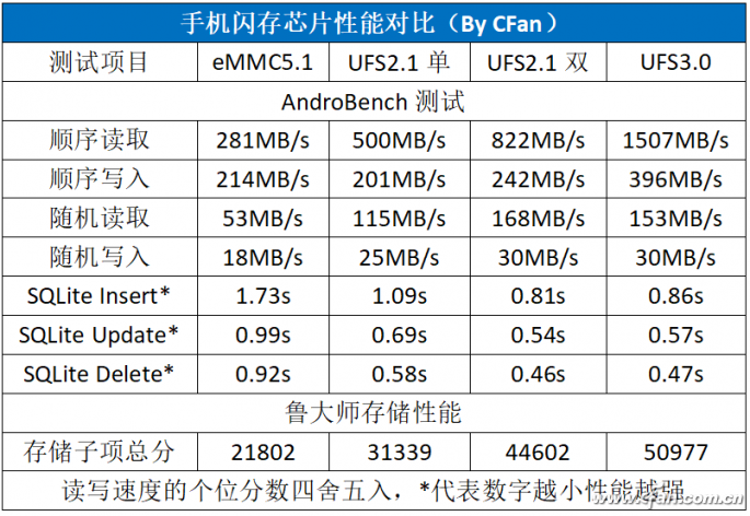 目前Android手机圈流行的闪存主要以eMMC5.1、UFS2.1单通道、UFS2.1双通道和UFS3.0为主。