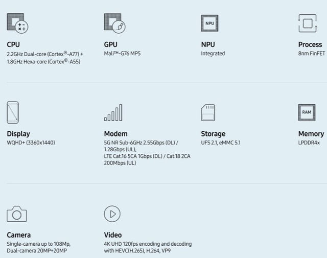 工艺、架构方面,Exynos 980采用8nm工艺,行业首款搭载A77架构CPU,比上一代性能提升20%。2颗2.2GHz的Cortex-A77核心和6颗1.8GHz的A55核心,GPU为Mali-G76 MP5,处理器架构更先进。