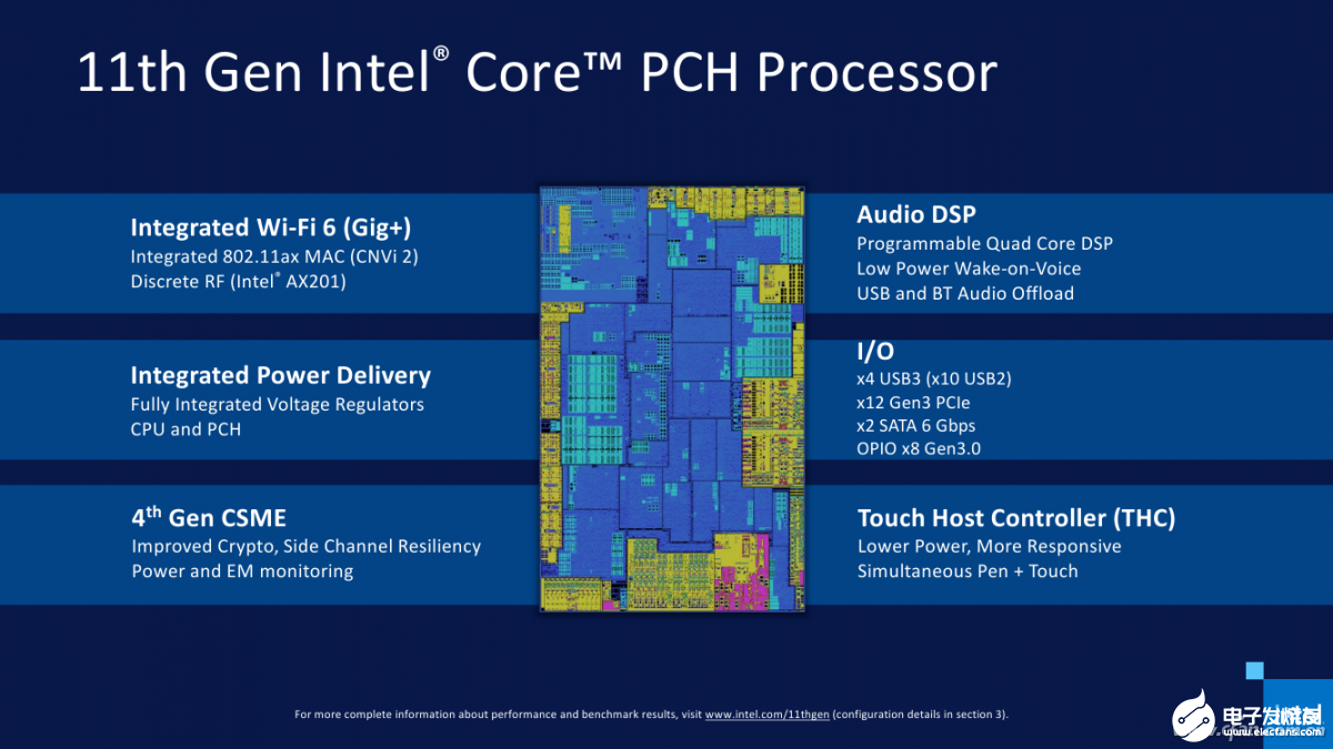 再来看看PCH芯片组规格,它集成Gig+ Wi-Fi 6、FIVR和DVFS、可编程四核音频DSP、第四代CSME、触摸主控,IO支持4个USB 3.0、10个USB 2.0、12条PCIe 3.0、2个SATA 6Gbps、8个GPIO。