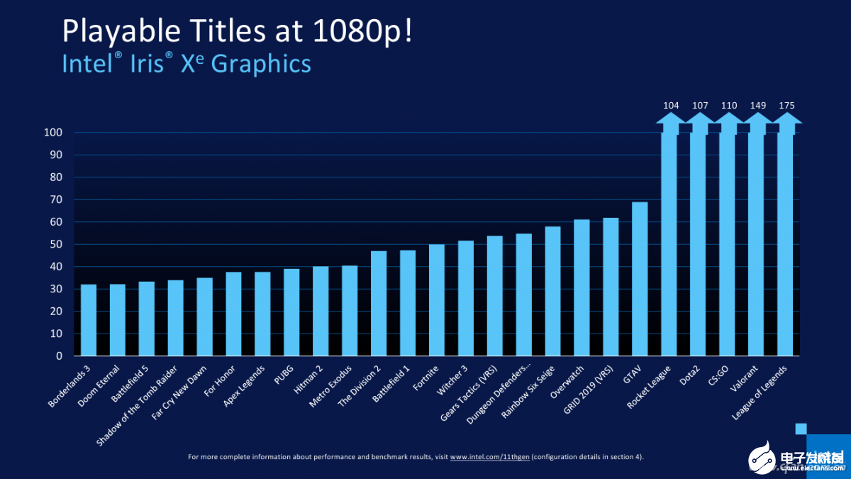 GPU方面,Iris Xe96核显在1080P分辨率下,3A大作普遍可以超过30FPS,轻量级游戏稳超60FPS,电竞游戏更是普遍在100FPS之上。
