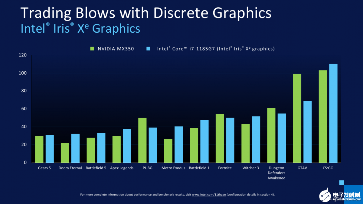 Iris Xe96和自家上代Iris 64核显相比,性能提升幅度在50%~100%之间。和锐龙7 4800U集成的Vega 8核显对比,最多可以提升80%。和MX350独显相比也是互有胜负。