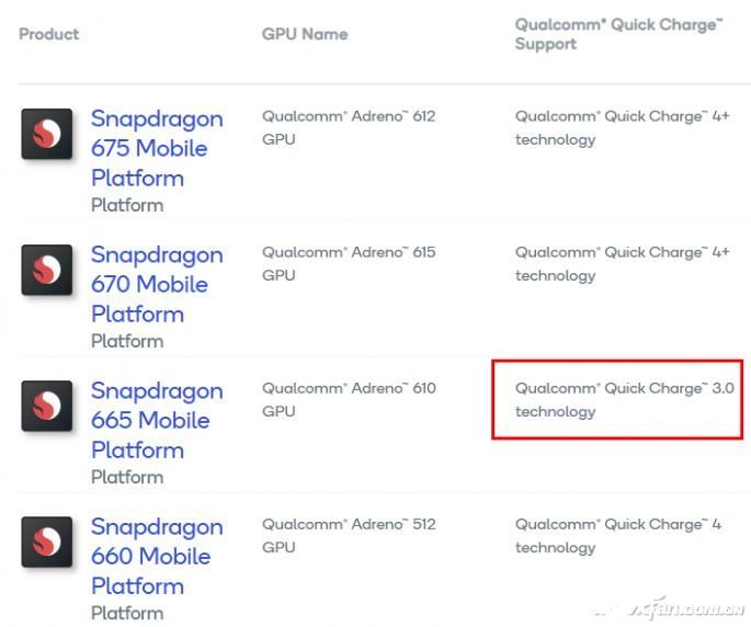 新一代骁龙处理器都支持QC4或QC4+快充技术,后者的改进在于兼容早期的QC3.0、QC2.0等技术,适用性更广泛一些。在这里我们不得不再提一下骁龙665,从高通官网的参数来看,它支持的快充技术竟然还停留在QC3.0的标准上,较之骁龙660还有所不如。