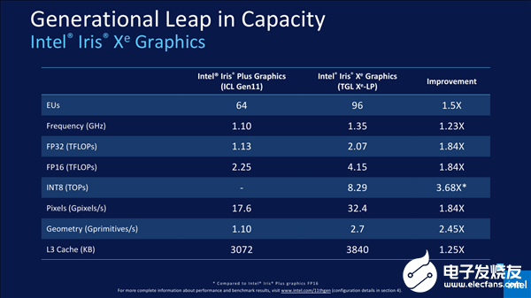 具体来说,十一代酷睿的锐炬Xe GPU在EU执行单元上比上代的十代酷睿Ice Lake中集成的Iris Plus扩大了50%之多,从64个EU单元增加到了96个EU单元,每周期Texel纹理、Pixel像素渲染能力也从32、16提升到48、24,性能是前代的2倍左右。