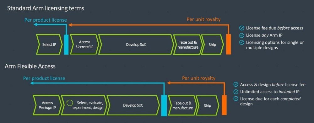 上图为ARM标准授权模式,下图则是全新授权方式,两者可以看见支付授权费用的时间点不同。