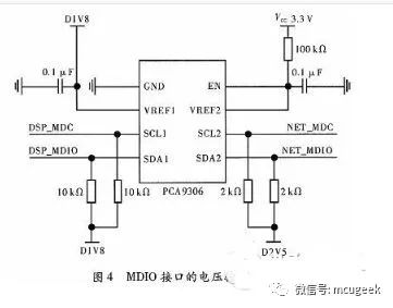 因为88E1111上集成的MDIO与C6678集成MDIO模块进行连接时,电压有所差别,前者电压为2.5 V,后者电压为1.8 V,所以在二者之间应该添加电压转换器。本文采用一片PCA9306,实现2.5 V和1.8 V之间的电平转换,其连接电路如图4所示。
