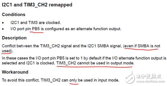 可以说CubeMx还是有不够严谨或者说考虑不周的地方。如果在开启I2C1情况下,当用户试图配置PB5作为输出时直接红色警告拒绝TIM3的remap就好了。但这样,可能又会影响到另外一类用户人群,他们根本不在乎PB5怎样,只关注PB4能用作PWM输出就好。有点众口难调的味道,参考手册在明确不支持STM32F1系列48脚的TIM3的REMAP操作的同时,结合勘误手册做了应用补充,以尽可能满足不同的应用需求。