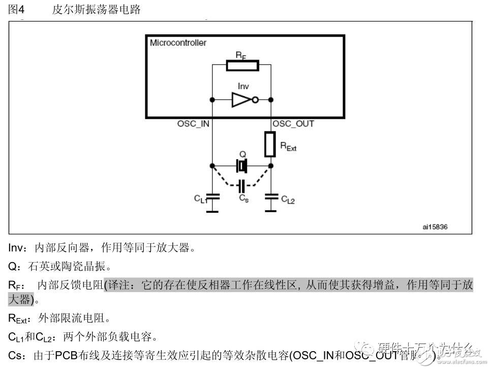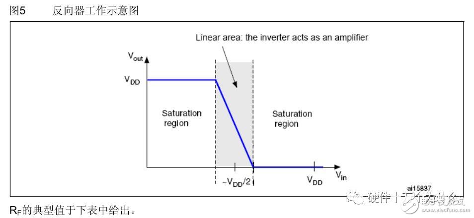 在大多数情况下,反馈电阻R F 是内嵌在振荡器电路内的(至少在ST的MCU中是如此)。它的作用是通过引入反馈使反向器的功能等同于放大器。Vin和Vout之间增加的反馈电阻使放大器在Vout= Vin时产生偏置,迫使反向器工作在线性区域(图5中阴影区)。该放大器放大了晶振的正常工作区域内的在并联谐振区内的噪声(例如晶振的热噪声)(译注:工作在线性区的反向器等同于一个反向放大器),从而引发晶振起振。在某些情况下,如果在起振后去掉反馈电阻R F ,振荡器仍可以继续正常运转。